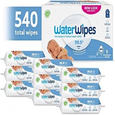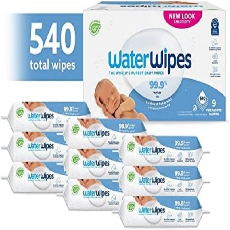 WaterWipes Plastic-Free Original Baby Wipes, 99.9% Water-Based, Unscented, Hypo-Allergenic, For Sensitive Skin, 540 Pieces (9 Packs), Packaging May Vary